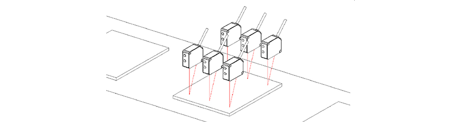如圖所示,可使用多個(gè)JC-85激光位移傳感器,可對(duì)多個(gè)檢測點(diǎn)同時(shí)進(jìn)行檢測。通過測量多個(gè)目標(biāo)點(diǎn)的高度判斷產(chǎn)品的平面度是否達(dá)到要求。