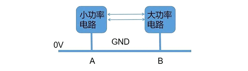 大功率電路,顧名思義,是電流比較大的電路。很顯然大的電流,容易造成不同功能電路之間的地偏移現(xiàn)象,如下圖所示。