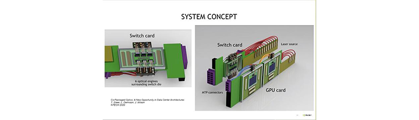 在英偉達(dá) GTC 2021 大會(huì)上,計(jì)算機(jī)架構(gòu)專家 Bill Dally 設(shè)想了未來的光學(xué) DGX,其中 GPU 通過有機(jī)封裝與電子集成電路進(jìn)行通信,解決了芯片間的互聯(lián)帶寬問題。