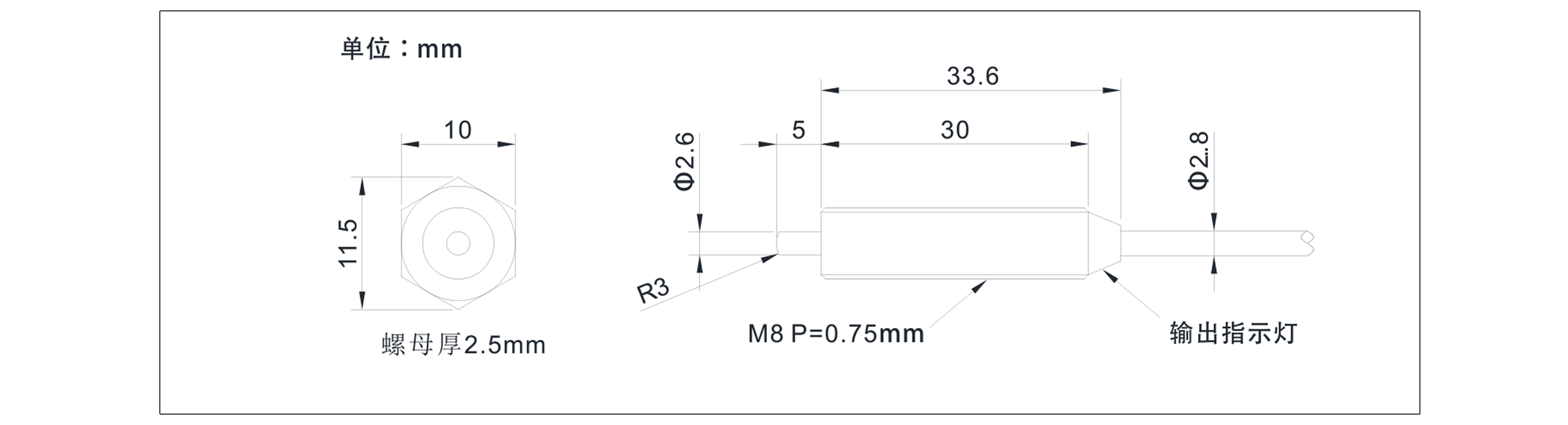 前端為長(zhǎng)5mm的感應(yīng)觸頭,頭部為圓弧狀;中部是全螺紋,尾部是感應(yīng)指示燈。