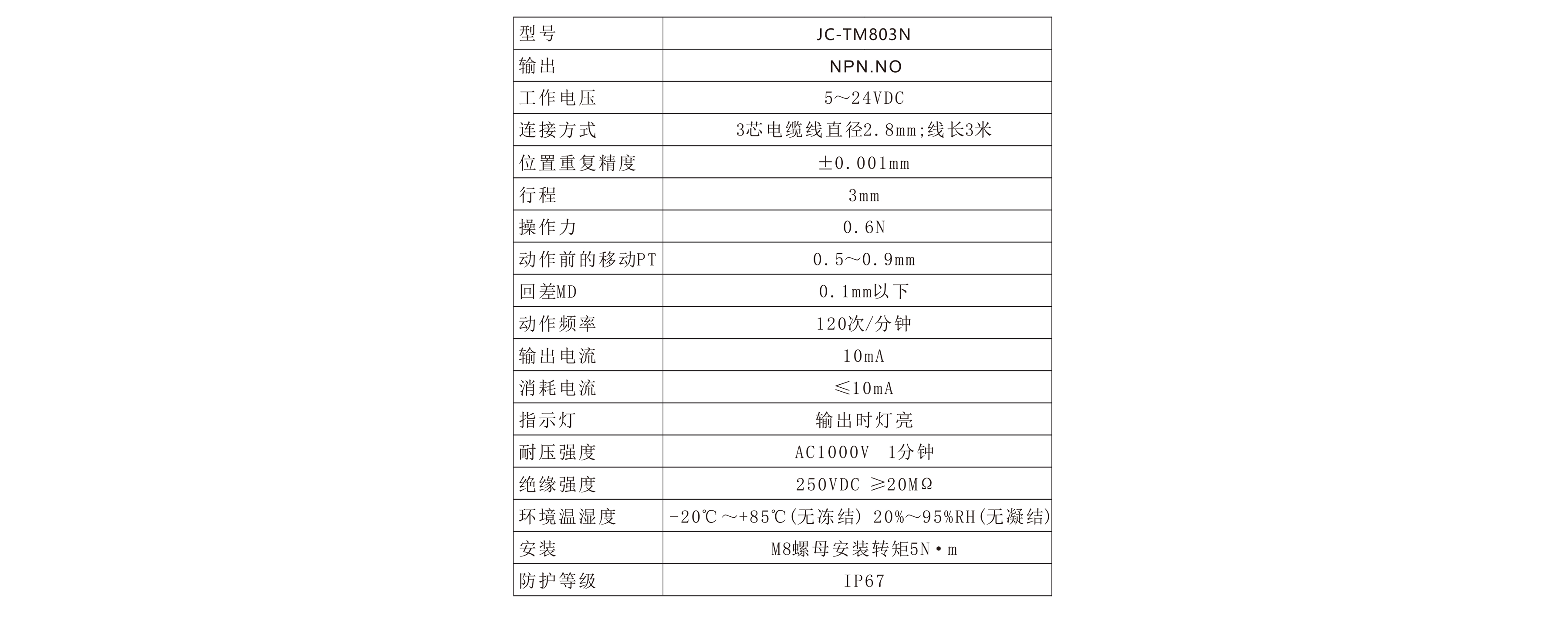 這款接觸式傳感器JC-TM803,通常會當(dāng)作限位開關(guān)來使用,當(dāng)有物體接觸到這款傳感器之后就會有信號發(fā)出,所以傳感器的使用的時候,對于它的精準(zhǔn)度是有一定的要求,這樣才能準(zhǔn)確檢測。