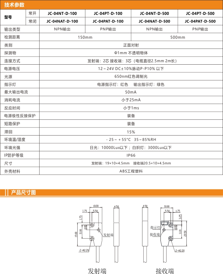 這款超薄光電是小光斑對射型,采用小光斑尺寸設(shè)計,500mm處光斑僅為中30mm,并配備方便觀察的雙色指示燈--紅色電源指示燈與綠色輸出指示燈。
