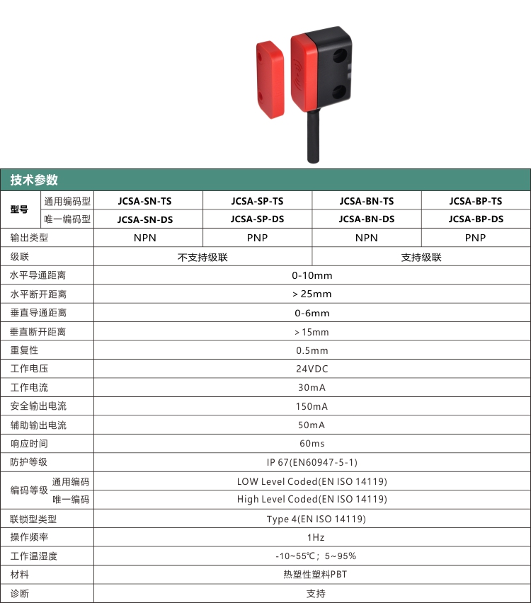 Jiance 非接觸式安全門開關JCSA系列 采用RFID無線射頻識別應用技術,無論周圍發(fā)生何種變化,都要安全地進行開關 ,非接觸安全開關工作穩(wěn) 定可靠。可以根據(jù)風險評估和機器設計的要求使用。