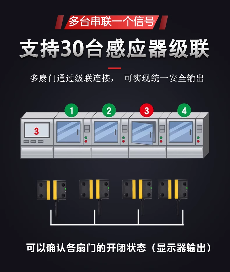 多個門通過級聯(lián)連接,可實現(xiàn)統(tǒng)一的安全輸出。確認是否有其中一扇門的開閉狀態(tài)不正常。
