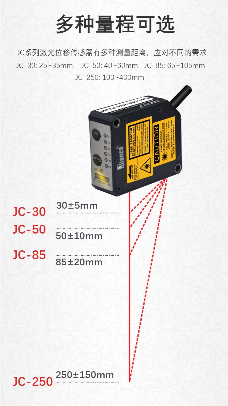 JIANCE 采用三角測(cè)量原理,激光束照射被測(cè)物體表面,反射光由接收透鏡聚焦到光敏元件。物體位移變化導(dǎo)致反射光斑位置移動(dòng),通過(guò)計(jì)算光斑位移量確定物體距離。