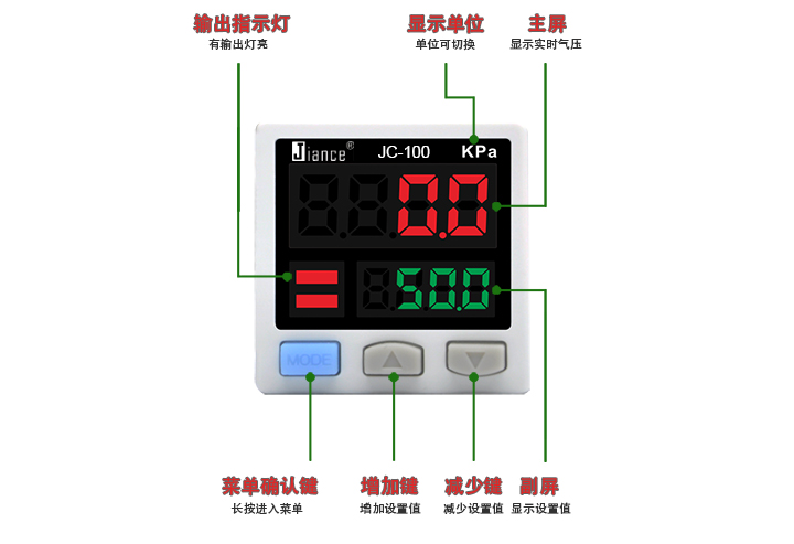 Jiance 壓力表帶有一個(gè)主屏顯示當(dāng)前氣壓值,副屏顯示設(shè)定值,同時(shí)副屏左側(cè)有輸出指示燈,下方帶MODE按鍵和加減鍵,可以進(jìn)入菜單進(jìn)行輸出模式、常開(kāi)常閉、反應(yīng)時(shí)間等設(shè)置。