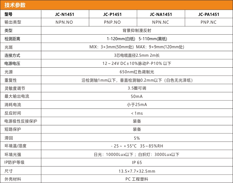 JC-1451系列具有抗強(qiáng)光干擾功能,在大部分光源下正常使用,包括工廠常用的白熾燈、LED燈等??蛊渌鼈鞲衅鞯墓飧蓴_和工業(yè)相機(jī)閃光燈的光干擾。