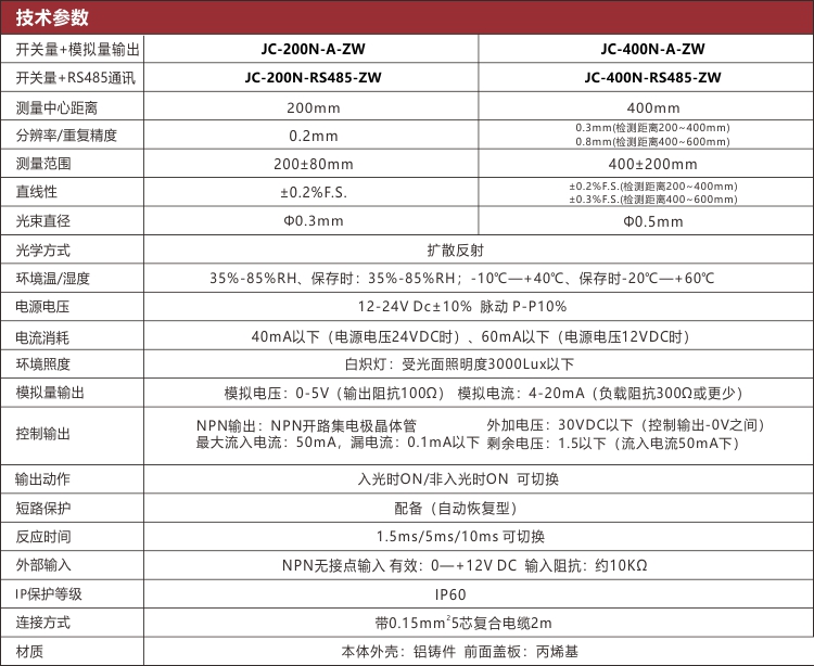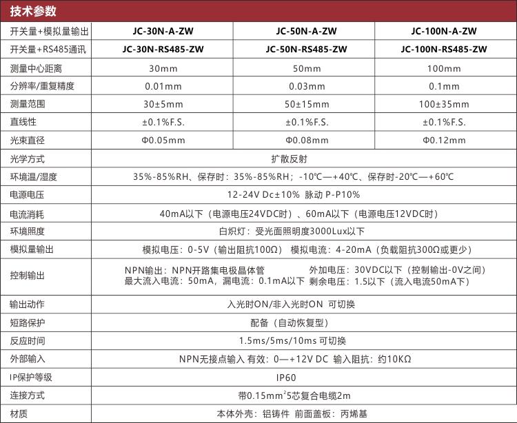 Jiance 小型激光位移傳感器 采用激光三角原理測量傳感器到激光照到的物體表面的距離,有多種量程可選30±5mm,50±15mm,100±25mm,200±80mm和400±200mm等,顯示精度0.01毫米,支持RS485通訊,并且具有開關(guān)量超差報警輸出。