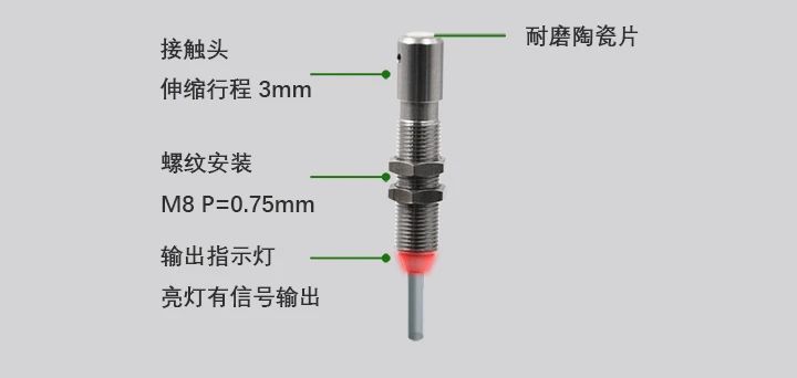 JIANCE 接觸傳感器 0.6N的力即可操作。位移重復(fù)精度0.001mm,動(dòng)作前移動(dòng)PT為0.5-0.9mm。高硬接觸頭耐磨損,結(jié)構(gòu)巧妙設(shè)計(jì),在水或油飛濺的場景可放心使用。不銹鋼金屬外殼,使用更放心更長久。